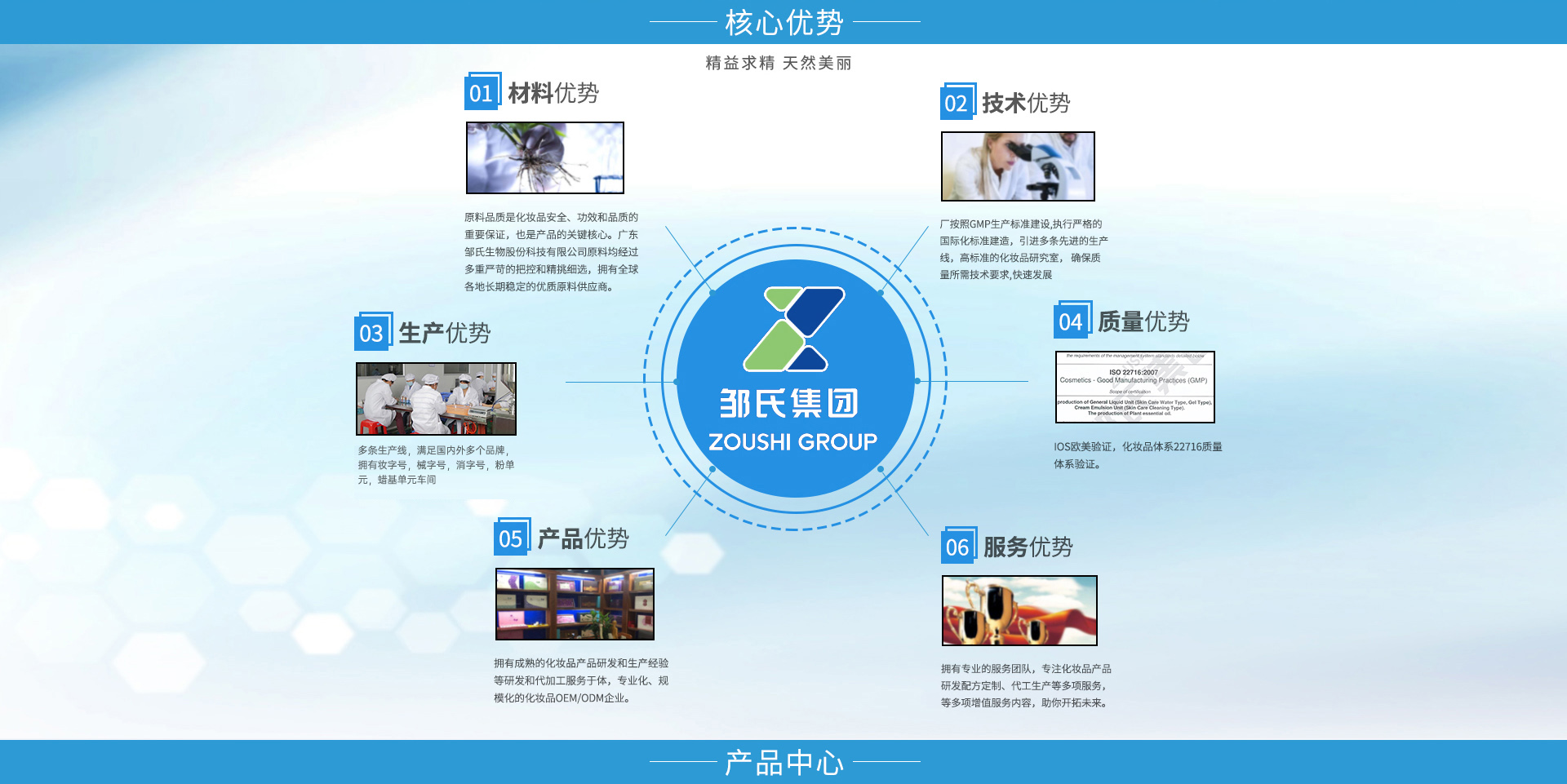 廣東鄒氏生物科技股份有限公司是一家集原料研制、配方開發(fā)、加工生產(chǎn)及配套性服務(wù)為一體的全球化化妝品OEM/ODM服務(wù)企業(yè)。鄒氏生物秉承“精益求精,天然美麗”的經(jīng)營理念,始終孜孜不倦的在美業(yè)領(lǐng)域深耕,經(jīng)過不斷發(fā)展完善與技術(shù)提升,在行業(yè)內(nèi)頗具口碑和影響力。公司擁有雄厚的資金實(shí)力、先進(jìn)的生產(chǎn)設(shè)備以及大批高精專的人才儲備,旨在打造一個純自主研發(fā),純自主生產(chǎn)以及管理的高科技日用美妝OEM/ODM品牌。 在延續(xù)高質(zhì)量產(chǎn)品和服務(wù)的同時,鄒氏生物始終秉承著純粹的生產(chǎn)理念,在研發(fā)、生產(chǎn)、品控、營銷等多方面升級,配備雄厚的科研力量,引進(jìn)先進(jìn)生產(chǎn)設(shè)備,遵循嚴(yán)苛的品質(zhì)管理標(biāo)準(zhǔn),提供專業(yè)的全方位營銷服務(wù),最大程度地實(shí)現(xiàn)資源整合,致力于成為世界優(yōu)秀化妝品工廠。為廣大品牌商以及消費(fèi)市場輸送品質(zhì)優(yōu)越、高效安全的日用化工、美容美妝、肌膚護(hù)理產(chǎn)品。
